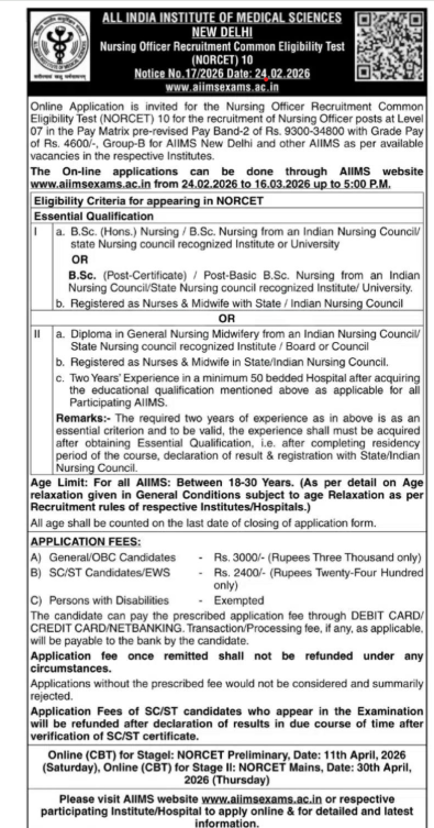 AIIMS Recruitment 2026 : Apply for AIIMS NORCET 10 Recruitment 2026! 2551 Nursing Officer (Group B) vacancies across AIIMS institutes. Check eligibility, exam dates (Prelims: April 11, Mains: April 30), salary (Level 7), and step-by-step application process. Don’t miss the March 16 deadline!
